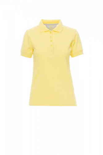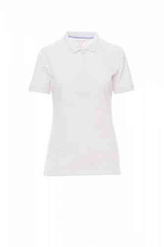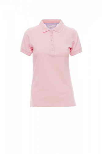 Polo sfiancata da donna manica corta a cinque bottoni in tinta effetto perlato, colletto e bordo maniche a costine, fini inserti in popeline celeste interno collo e spacchetti laterali, rinforzo sagomato retrocollo.