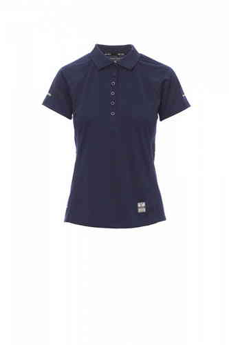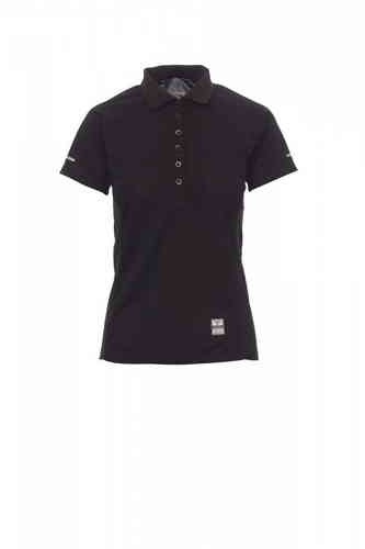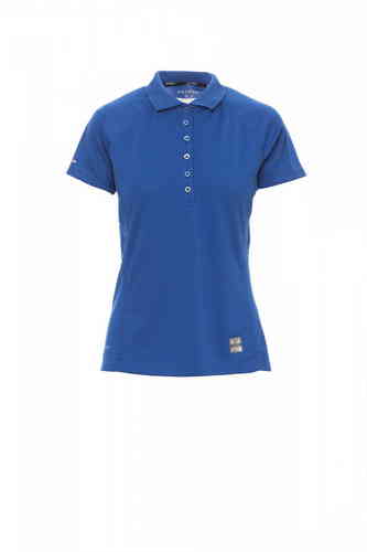 Polo tecnica-sportiva sfiancata da donna manica corta a sei bottoni in tinta, manica raglan, doppia cucitura laterale per una migliore vestibilità, fondo sagomato e piùlungo sul retro, inserto riflettente alla maniche e retro collo, nastratura del collo a