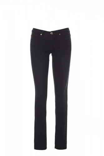 Pantalone donna, taglio jeans a cinque tasche, chiusura con zip in metallo e bottone, passanti in vita, stone wash, effetto consumato e delavà©. Cuciture a filo grosso a contrasto, doppie cuciture interno gamba, gamba a tubo, borchiette e patch in vera pe